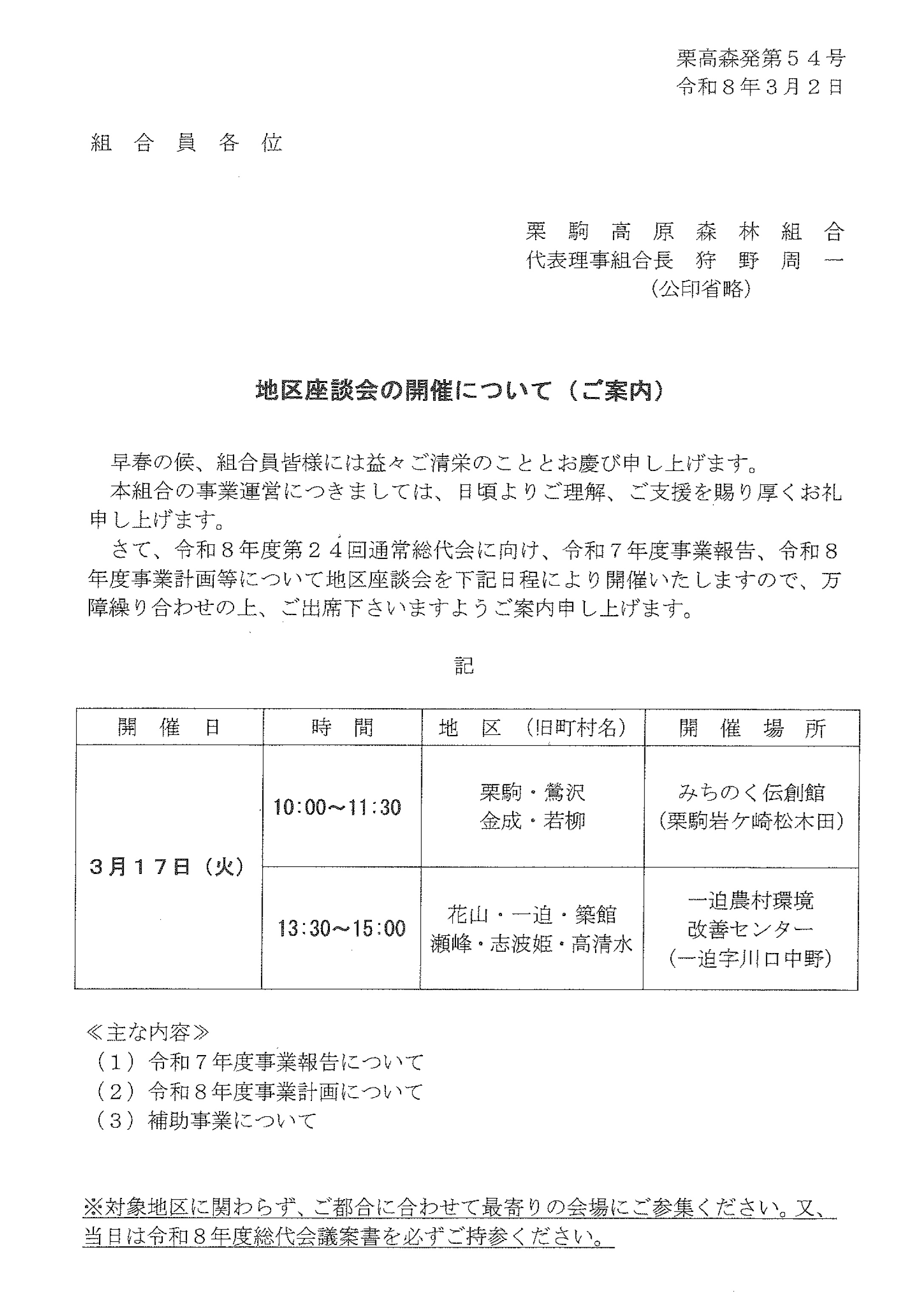 下記のとおり、地区座談会を開催します。組合員皆様のご出席お待ちしております。